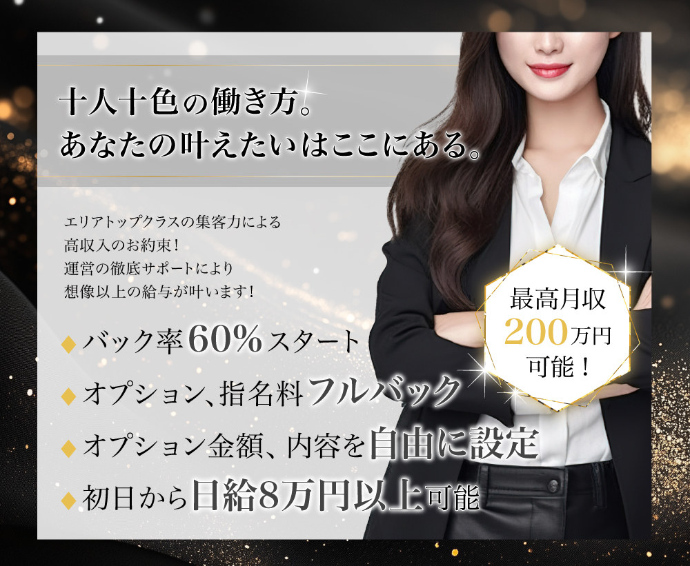 給与 | コース料金50%バック、オプション料金・指名料は全額バック! 日給50,000円以上のセラピストが多数在籍しております。 |